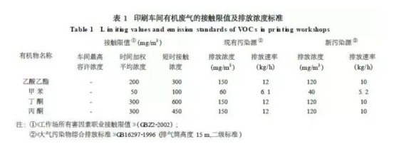目前在我國的包裝塑料基材等印刷過程中大量使用的溶劑型油墨,含有50%~60%的揮發(fā)性組分,如果加上調油墨粘度所需的稀釋劑,那么在印品干燥時,揮發(fā)性組分的總含量為70%~80%。這些有機溶劑所揮發(fā)的氣體,通過呼吸進入人體內,對人體的肝臟和神經系統(tǒng)造成損害;有機化合物排放到大氣中,與氮氧化物反應,發(fā)生光化學反應,形成光化學氧化劑而毀壞森林與破壞生態(tài)環(huán)境。一些_制定了“勞動衛(wèi)生法”、“有機溶劑排放法”等一系列法規(guī)。我國在各種印刷過程及傳統(tǒng)耗材中存在VOCs排放造成污染問題,例如在包裝印刷廠的主要產品為各種塑料薄膜的印刷制品,在生產中大量使用彩色油墨和有機稀料,油墨用的稀料(溶劑)主要是甲苯、乙酸乙酯、丙酮及少量丁酮。這些溶劑在產品生產過程中變?yōu)?/font>VOCs廢氣大量排出。因此,對包裝印刷廠生產車間排出的VOCs廢氣_采取有效的收集方法和凈化工藝進行處理。在我國的工作場所有害因素職業(yè)接觸限值和排放標準中,對VOCs廢氣的排放作了嚴格的規(guī)定,如表1所示。如果在印刷車間安裝合理的廢氣收集系統(tǒng)和溶劑回收裝置,可以達到降低VOCs揮發(fā)量和減少污染的目的;同時可以回收溶劑資源,這點已經被實踐證明。